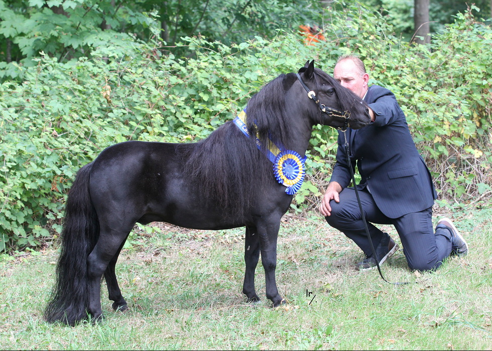 Na al dat jonge geweld kwamen we bij de stamboekopnames. Jammer genoeg was de ingeschreven hengst voor stamboekopname afgemeld. Maar gelukkig hadden we wel een mooie bezetting in de rubriek stamboekopname Falabellamerries. Deze rubriek werd gewonnen door de algemeen kampioen van vorig jaar: Kiara van Anté van John Bouwmeester. Elena van Brezal van Carin en Ids Waterlander die tweede werd in deze rubriek kon tijdens de kampioenschappen de jury toch meer overtuigen en werd reserve volwassen kampioen. De titels van volwassen kampioen en van algemeen Falabella kampioen gingen deze keer naar Azul Resto Cazador (zie foto) van Yvonne van Werkhoven. Deze prachtige zwarte hengst wist ook dit juryteam te overtuigen, want hij werd ook in 2016 al een keertje algemeen Falabella kampioen!